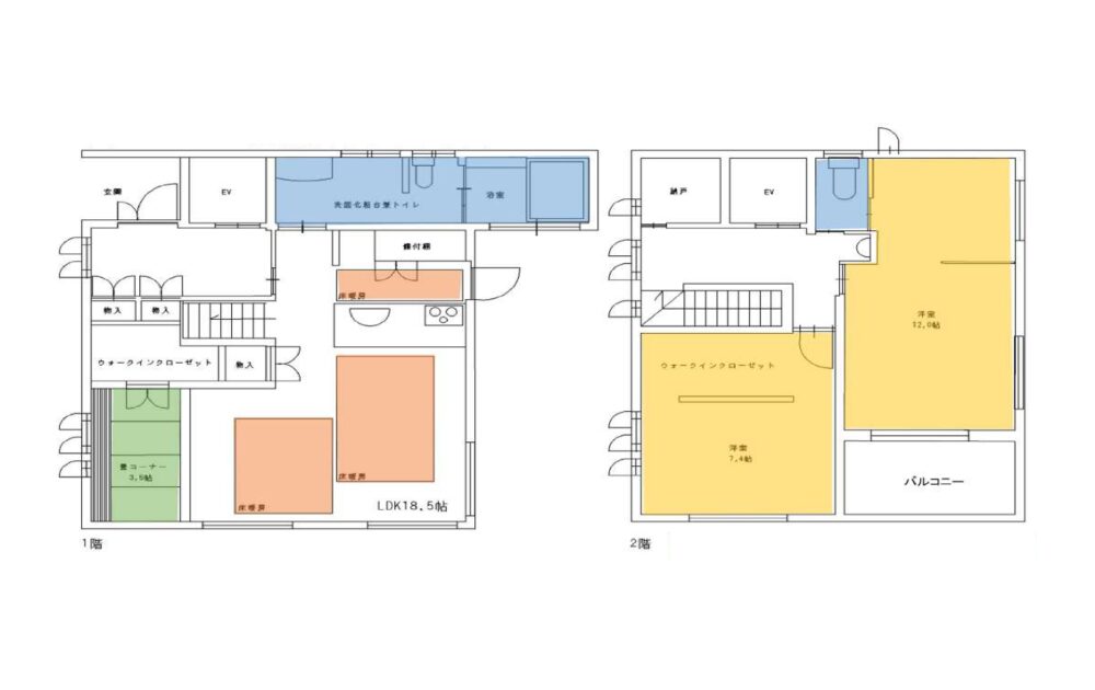 間取り2LDK+畳コーナー(1階:LDK18.5・畳3.5/2階:洋12.0・洋7.4)